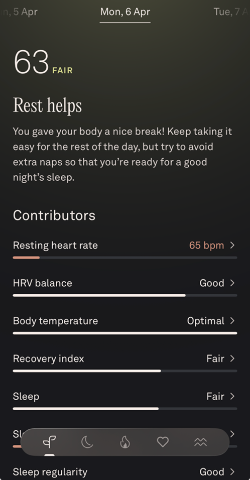 Readiness 63. Ocjena: fair. Poruka aplikacije je jasna: Rest helps. Tijelo je umorno, Recovery index skroman, san osrednji. Nema paničarenja, nema dramatike, samo miran i jasan savjet: uspori. I to je upravo ono što sam učinio.